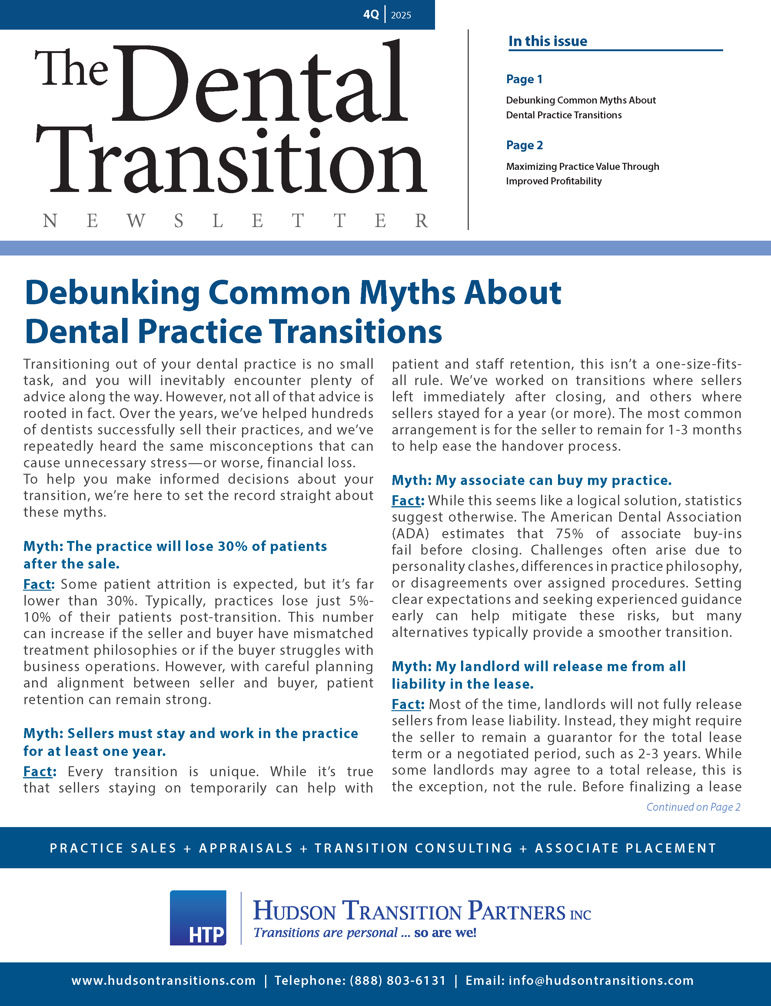 Looking to retire, relocate, or transition out of ownership? Hudson Transitions will help you maximize the value of your dental practice. Our team utilizes strategic marketing, professional valuations, and targeted outreach to qualified buyers. We ensure your practice is presented in the best possible light to attract serious inquiries and achieve a successful sale.